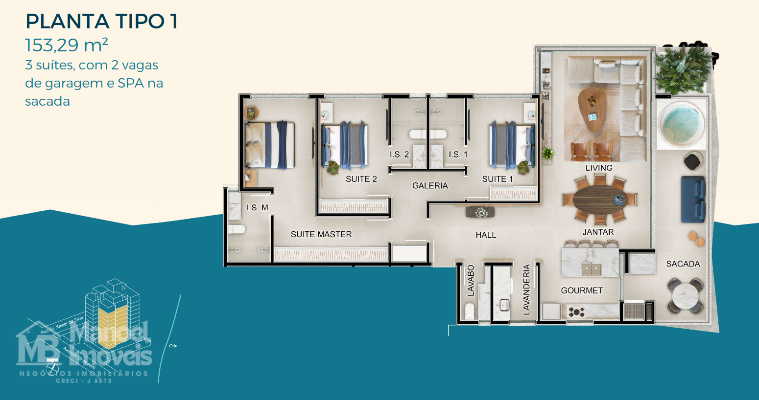 153,29 m² privativos – 3 suítes, 2 vagas de garagem e um SPA privativo na sacada, seu oásis particular.