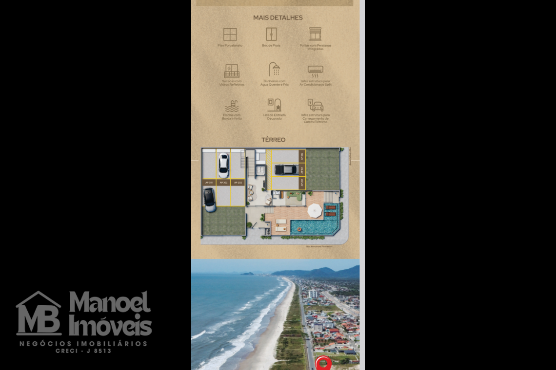 Este apartamento foi projetado para proporcionar conforto e bem-estar, com ambientes amplos e bem distribuídos. Destaque para a sala de estar integrada, a cozinha funcional e a sacada com churrasqueira e vista para o mar, ideal para momentos de convivência com família e amigos. Sua localização à beira-mar garante luz natural, ventilação e uma atmosfera única de litoral.